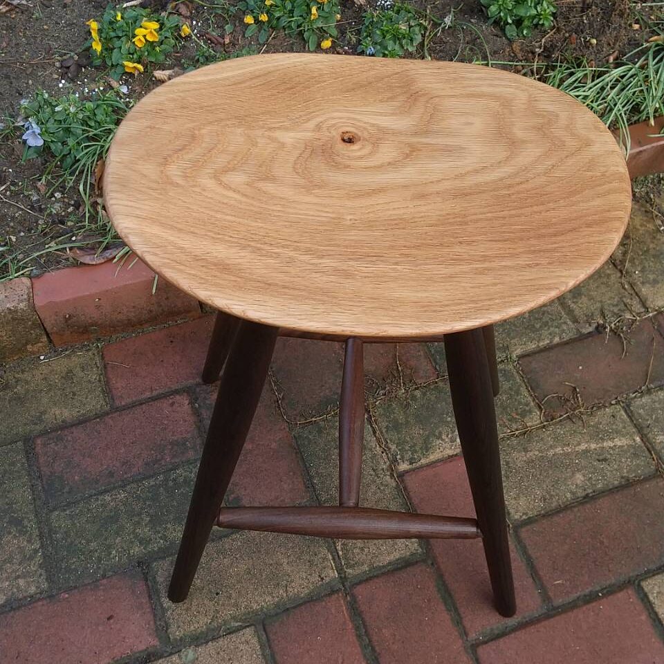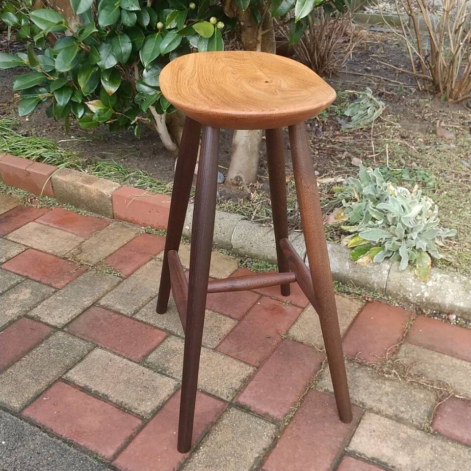スツール サイズ:幅415、座面590、奥行315(mm) 素材:楢(オーク)、神代欅 仕上げ:オイルフィニッシュ